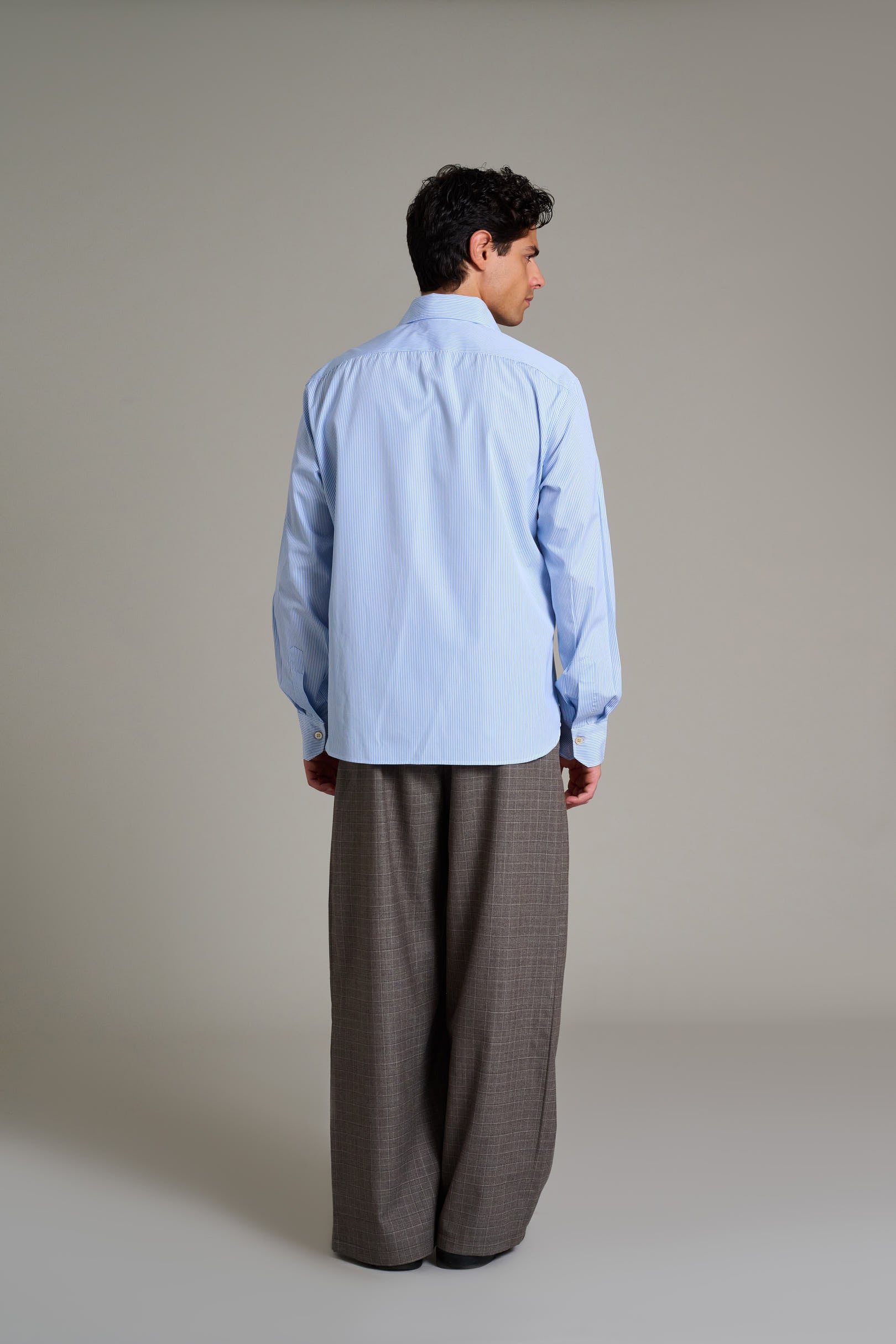 This light-blue shirt channels a timeless, old-world elegance, echoing the quiet sophistication of classic menswear while embracing a modern, relaxed sensibility.
