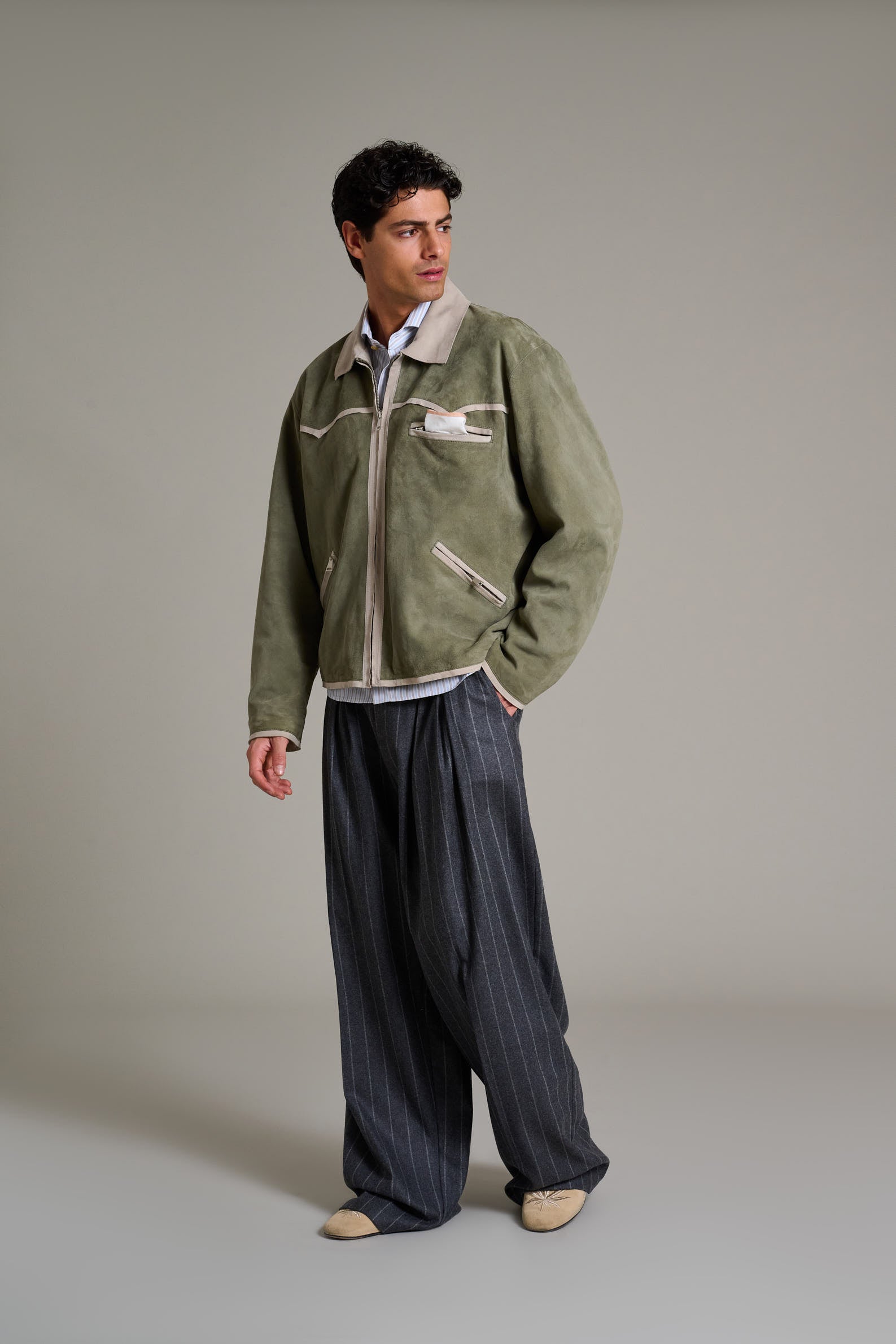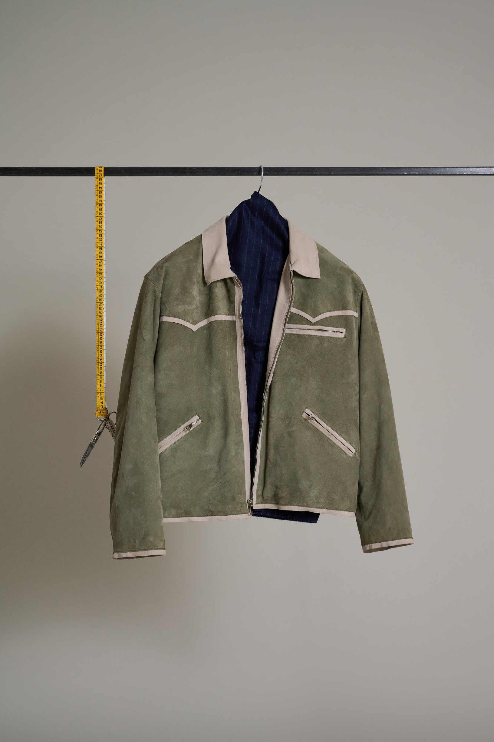 Our olive–green suede jacket draws inspiration from Texan lines and italian tailoring, reinterpreted through a clean and contemporary lens.