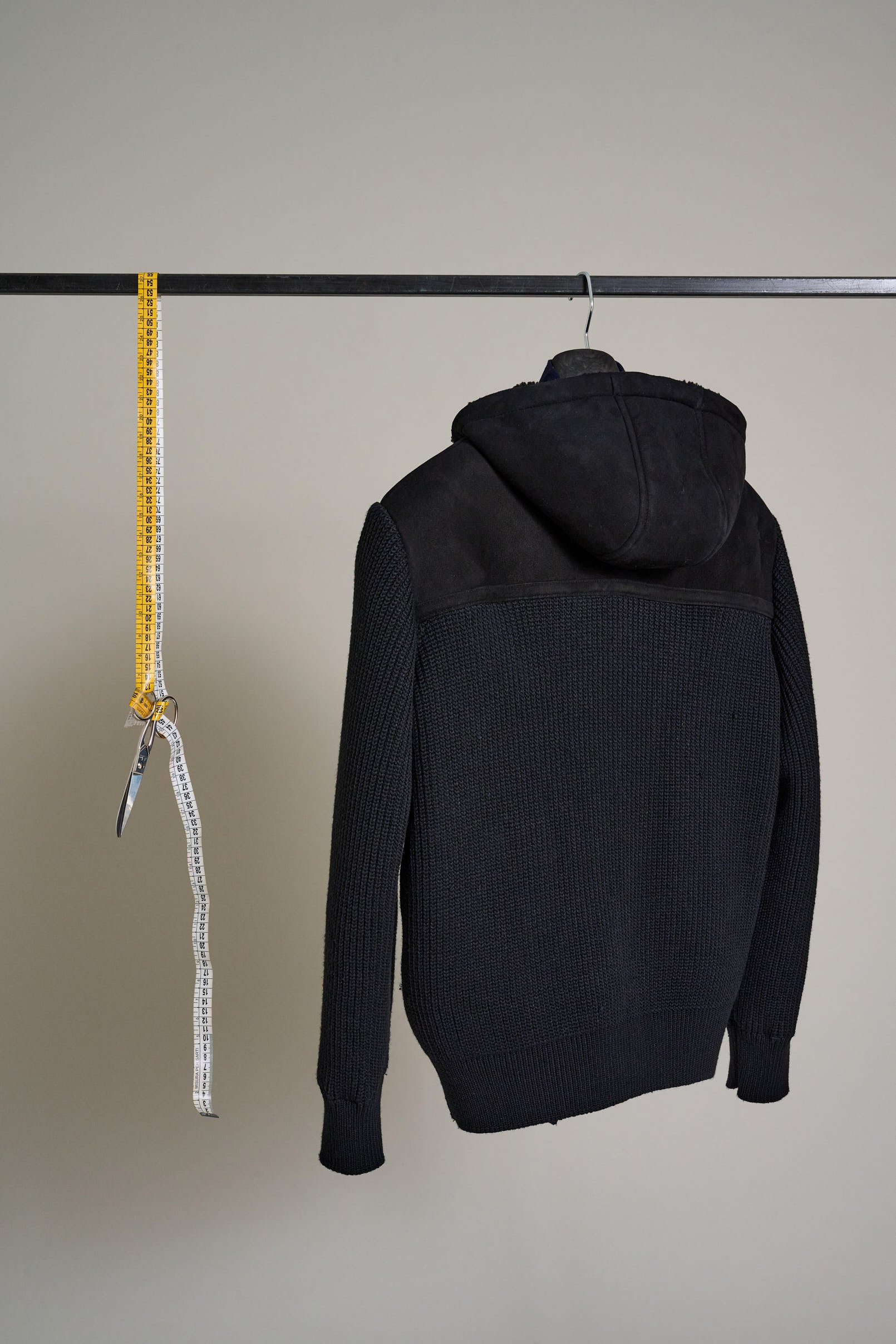 The body is rendered in supple suede, deep and velvety to the touch, offering a refined contrast to the ribbed wool sleeves and back, which add depth, movement, and a subtle architectural balance. This dual material construction creates a silhouette that feels both distinguished and modern precise yet undeniably soft.